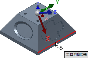 - 现在,需要指定 X 轴的方向。确保“X 轴刀具朝向”按钮处于激活状态,并选择如下图所示的零件的水平边: