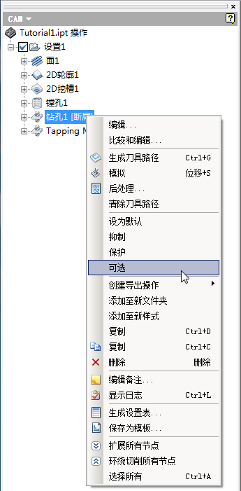 若要将操作设置为可选,请在 CAM 浏览器中的操作上单击鼠标右键,然后从弹出式关联菜单中选择“可选”。您可以通过再次选择“可选”将操作设置为非可选。