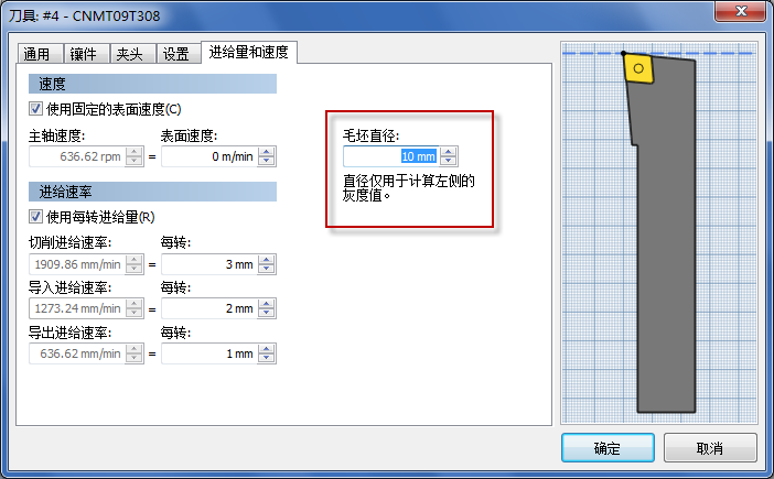 毛坯直径发生更改时,表面速度和进给速率参数会自动更新。