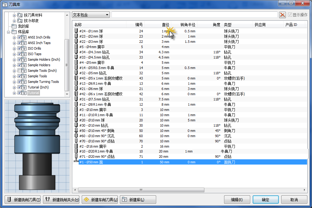 您可以通过单击字段列对刀具库中列出的刀具进行排序。例如,如果您希望所列刀具按直径排序,只需单击“直径”列即可。单击相同列两次可在升序顺序和降序顺序之间切换。