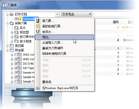 Inventor HSM 支持您将打开的文档中的刀具表导出到常规刀具库。如果您已为机床设置文档刀具表,并且想要在其他文档中重复使用它,则该功能非常有用。