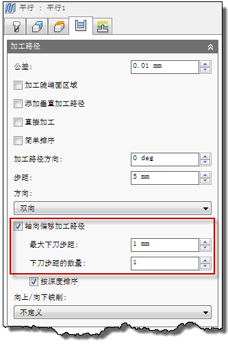 在 2D 操作中,轴向偏移加工路径的工作方式与多个精加工下刀步距很相像,并且对于使用几个步进来消除固定量的毛坯非常有用。例如,如果您留下 1 毫米的毛坯,则可以使用平行精加工通过五个 0.2 毫米的加工路径来移除它。