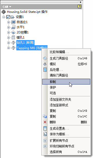 抑制的操作“钻孔 1”和“攻螺纹 M6”暗显为灰色