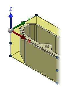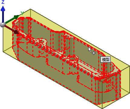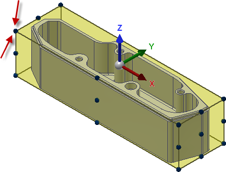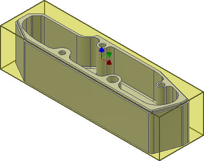 在图形窗口中,将绕零件的边界盒自动创建毛坯材料。模型朝向将按零件顶部中心的 WCS 显示。XYZ 朝向是正确的,但我们需要更改 WCS 原点。