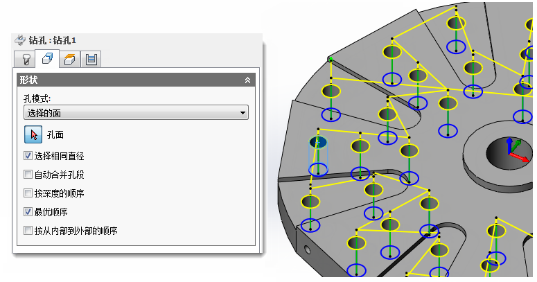 使用钻孔功能的最简单的方式是选择孔的圆柱面以直接钻孔。这样会为每个孔自动设置正确的毛坯高度和深度,并允许通过单一钻孔功能将孔放置在不同的平面上并具有不同的深度。此外,还会启用“选择相同直径”选项,这样可以轻松选择多个相似的孔。