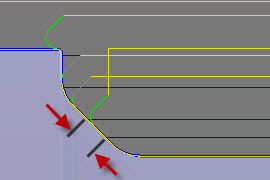 当使用负径向加工余量大于转角半径的球头刀具或半径刀具时,负轴向加工余量必须小于或等于转角半径。