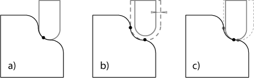 a) 位于较大圆角上的小刀具的理想位置仅具有一个接触点并且未检测到