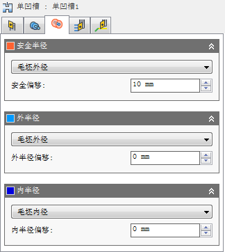 设置此高度以控制刀具进入和退出刀具路径的半径。刀具将沿 Z 轴(主轴线)在此径向安全偏移处从毛坯内部进刀和退刀。在橙色选项卡上显示的值表示相对于设置轴的当前半径。