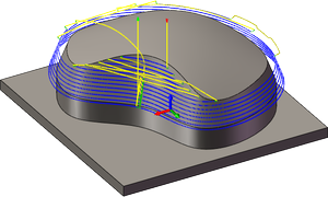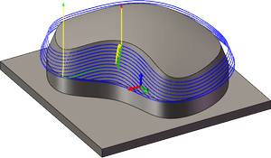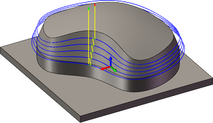 对于不完全水平的曲面,Inventor HSM 会在轴向和径向(壁)加工余量值之间插值,因此在这些曲面的轴向方向上剩余的毛坯量可能不同于指定的值,具体取决于曲面坡度和径向加工余量值。