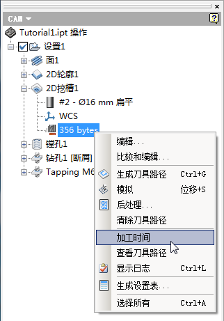 计算操作的加工时间是制造流程中非常重要的一个环节。Inventor HSM 可以为选定操作高度准确地测量和计算加工时间。从 CAM 浏览器中,在操作的刀具路径组件上单击鼠标右键,然后从弹出式关联菜单中选择“加工时间”。