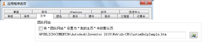 2. 在“文件”选项卡上,在“团队网站”字段中指定网站或文件。它可以是指向 Inventor 教程的链接,或者是您选择的文件或 URL。