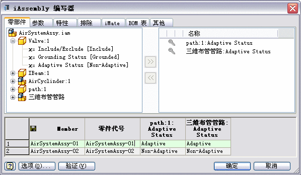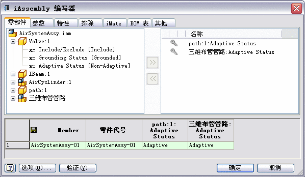 “iPart/iAssembly 编写器”。 主管路部件的文件名显示在候选对象列表中,默认情况下为“三维布管管路”。自适应状态被自动选入配置表。