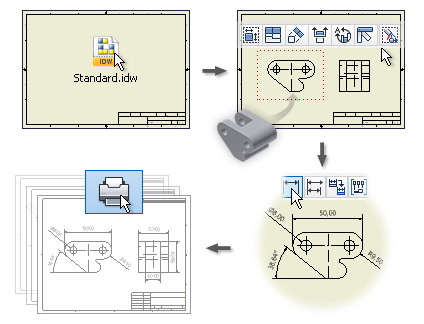 若要创建工程图,可以打开模板,根据需要设置它的格式,创建工程视图以及添加标注。完成后,可以打印工程图。