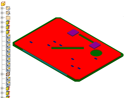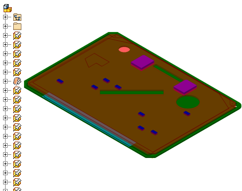 当导入为零件文档时,电路板零部件将转换为草图和拉伸,以构成层次结构中的零件模型。将 IDF 数据作为单个零件导入可以简化文件的管理。这样可以减少为了显示 PCB 部件的准确表达而必须打开的文件数量。