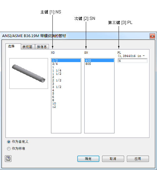管材 iPart 通常有三个族键列:公称尺寸、管号和管长。对于样例管材 iPart: