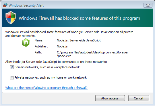 解决方案:在防火墙设置中删除“%ProgramFiles%/Autodesk/Desktop Connect/forever/node.exe”中的现有异常,然后重新启动 Inventor。系统显示提示时,在“Windows 安全警报”对话框中选择“允许访问”。