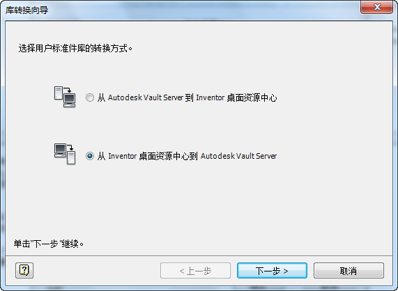 - 单击“库转换向导...”按钮以启动“库转换向导”对话框。请参见图 2。选择“从 Inventor 桌面资源中心到 Autodesk Vault Server”。