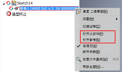 在零件文件中,在浏览器中的“参考”节点上单击鼠标右键,然后从关联菜单中选择“打开父部件”以在创建该参考的部件文件中检查交叉零件参考。选择“打开参考”以打开从其创建该参考的零件。