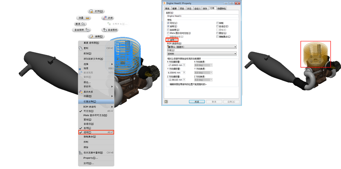 现在,可以切换部件中零部件的透明度,而不应用外观替代。