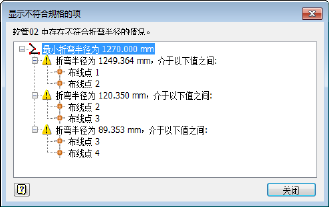 选择有问题的弯曲半径时显示的消息框已替换为新的“显示不符合规格的项”对话框。新的“显示不符合规格的项”对话框会显示一个树状列表,其中包含出现不符合规格的弯曲半径的样条曲线段。在对话框中选择一个节点会在图形窗口中亮显对应的线段。