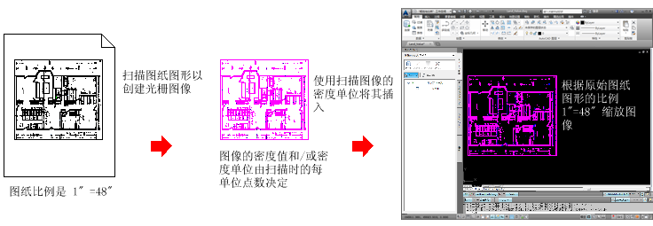 下例中的图像是以 1 英寸 = 48 英寸 的图纸比例绘制的,以每英寸 300 点扫描,并使用 300 作为密度值和使用英寸作为密度单位插入到图形中。然后,此图像基于其图纸比例 1" = 48" 进行缩放。