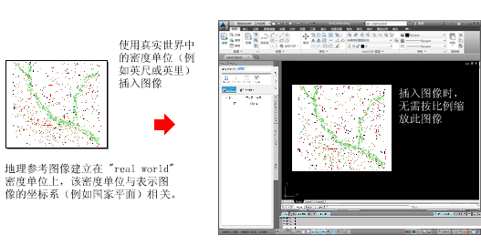 下例显示了密度单位与地理参照图像之间的关系。因为无需考虑图纸比例,所以可以使用图像表示的单位插入图像(例如英尺或英里),并且插入图像时无需进行缩放。