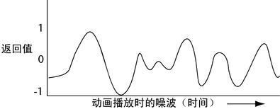 在动画播放时,每次表达式执行都返回 -1 和 1 之间的值。因为时间以细微增量增加,所以返回的值会以平稳但随机的模式增大和减小。如果您要为一段时间中返回的值绘制图表,它们可能会以下图中所示的形式出现:
