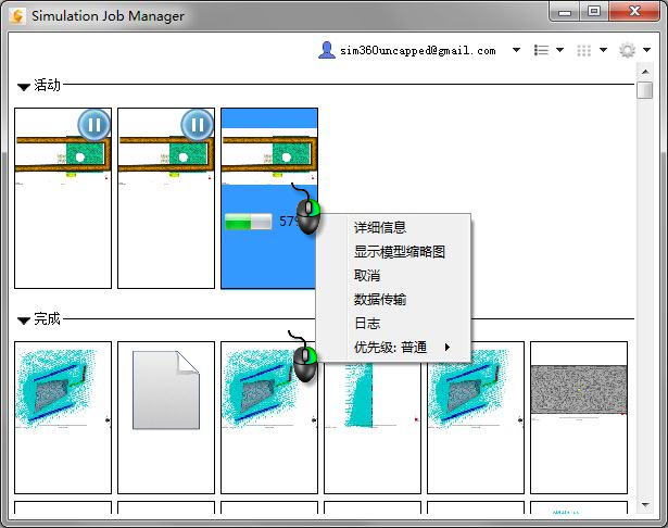 - 详细信息:打开所选作业的详细信息视图,并列出状态、作业类型、优先级、计划的时间、开始时间和完成时间、源计算机以及模型的缩略图。在作业运行期间,进度条会指示模拟的进度。单击“确定”可关闭详细信息视图。