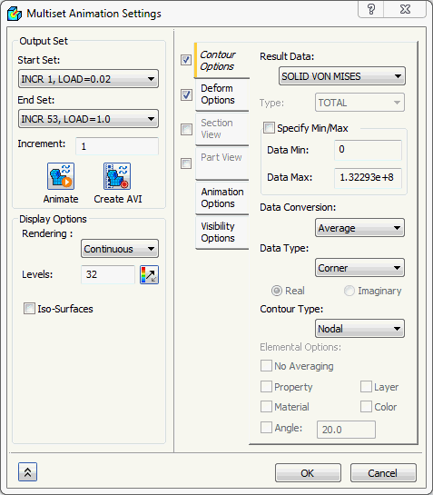- 右键单击“结果”,然后选择“多集动画设置”。将“结束集”更改为最后一步。选择“SOLID VON MISES STRESS”,将“动画选项”中的“延迟”更改为“100”。确保选中“变形选项”和“轮廓选项”而且“变形比例”设置为“实际”。