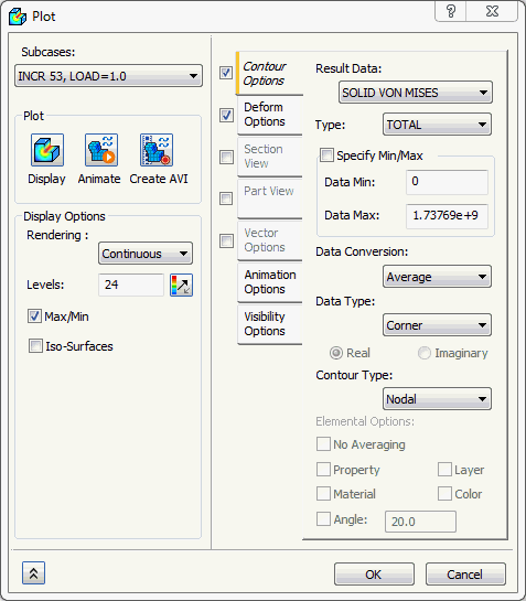 - 为“轮廓选项”下的“结果数据”选择“SOLID VON MISES STRESS”、取消选中“显示选项”下的“最大/最小”,然后单击