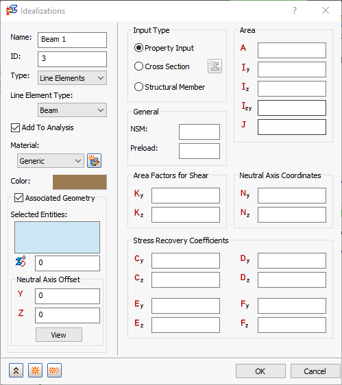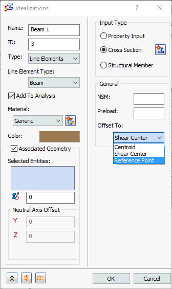 梁是每个节点上具有六个自由度的一维单元,其中剪切中心可以偏移。可以选择使用“输入类型”下的“特性输入”、“横截面”或“结构构件”。有关“输入类型”和关联设置的详细信息,请参见线单元特性页。