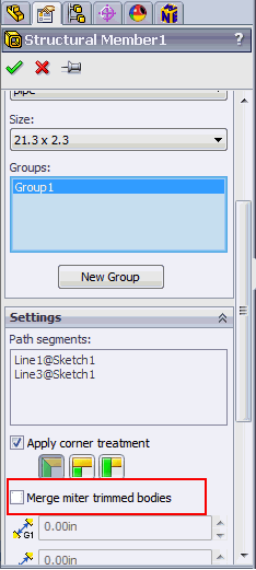 提示: 对于沿构件长度(非跨度端处)出现的交点,“合并斜接修剪主体”选项不会出现在“结构构件”对话框中。但是,在某些 SolidWorks 版本中,交点的行为可能会与合并实体时的行为相同,从而可防止 Nastran In-CAD 接受杆件,并允许您在“理想化”对话框中选择它。如果您遇到此问题,请按如下步骤修改交点:
