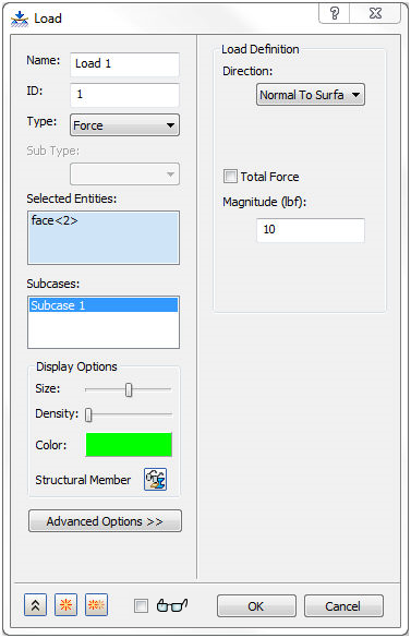 与“约束”类似,可以拖放“载荷”,或单击鼠标右键并选择“子工况”-“编辑”,然后将其亮显以将其包含在“分析”中。