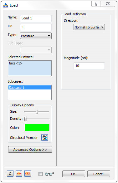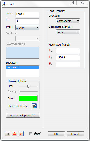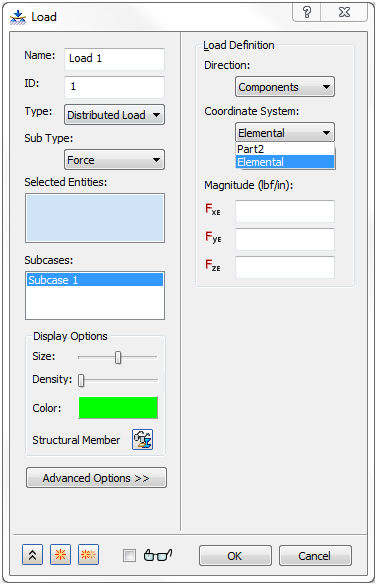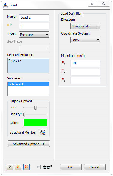 “载荷定义”部分取决于在“载荷”窗体上选择的“类型”。此部分包含三个子部分:“方向”、“坐标系”和“幅值”。以下示例说明了某些载荷类型。
