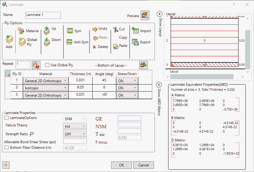 - “层压板”选项允许用户定义复合层压板属性。单击“新建层压板”按钮。此时将打开“层压板”对话框。