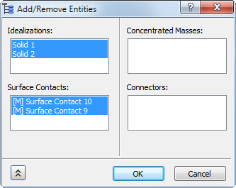 在列表的“表面接触”下,最初亮显的条目已在当前分析中处于活动状态。最初未亮显的条目将仅存在于树的“模型”分支中。单击可切换接触条目的选择状态。单击“确定”后,亮显的接触对将添加到当前分析中,未亮显的条目将从分析中删除(如果它们位于该分析中)。此工具无法从树的“模型”分支中删除接触对。在下图中,上述对话框中选定的两个手动表面接触对已添加到分析中。