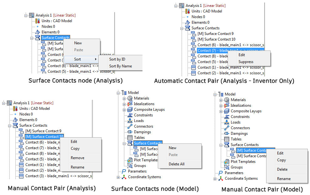 表面接触的关联菜单取决于您在何种实体(表面接触组标题,自动生成的接触对或手动指定的接触对)上单击鼠标右键: