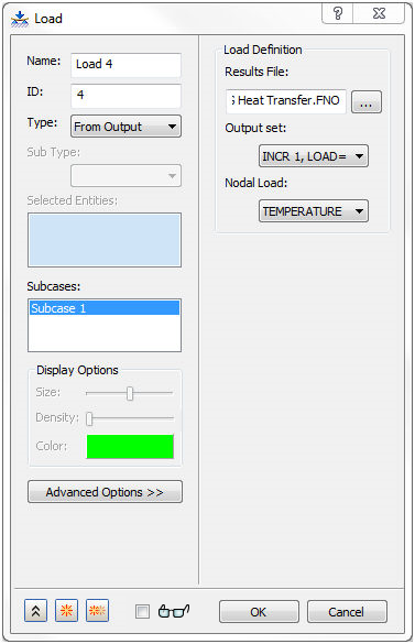 此浏览按钮允许加载结果文件 (*.FNO) 和使用当前加载的结果文件作为输入载荷。目前,“节点载荷”下拉列表仅支持温度输出。可以选择要从中获取节点数据的输出集以及要添加载荷的子工况。“从输出”载荷温度只能应用于结构分析。