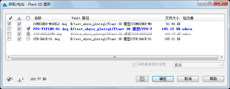 如果您获取或检出参照其他图形文件(外部参照)的文件,则会将参照的图形添加到“检出”对话框中并自动下载它们(例如:如果您检出 combined-models.dwg,则会将它参照的三个附加文件添加到列表中)。