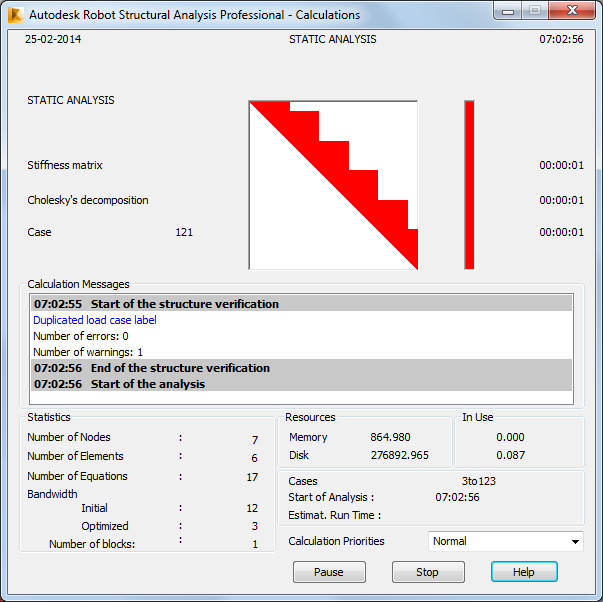 Note: If the model was defined properly there should not be any messages. However, if there are problems with the analysis, the Calculation Messages dialog box opens as shown below. Warnings prompt you to check any suspicious elements (no supports, disconnected part in the model, too weak elements, too many restrains, etc.). Some of the causes might be intentional and justified, but others might result from modeling errors and should be corrected before the analysis is run again.
