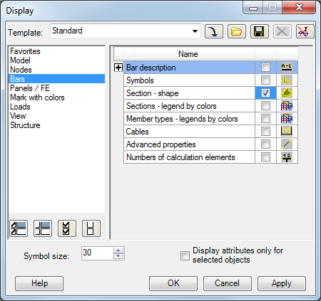 In the Display dialog box, select Bars from the list of objects , and then select Section - shape from the list of attributes as shown below.
