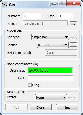 In the Bars dialog box, the default Bar Type is set to Simple bar and the Section is set to IPE 100 as shown below. For this practice you need to add two other sections.