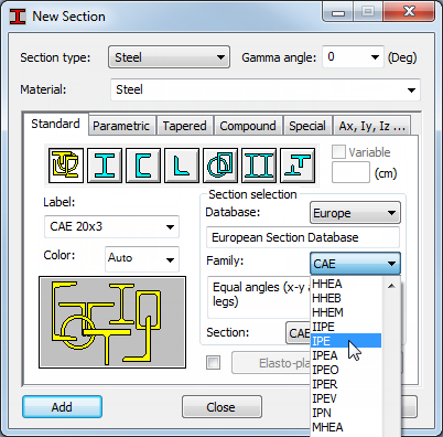 In the Section drop-down menu, select IPE 270 and click Add . Repeat this step and add the IPE 330 section.