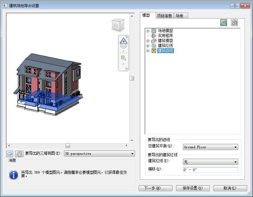 第一次打开“建筑场地导出设置”对话框时,默认情况下预览窗格中会显示活动的三维视图。如果活动视图不是三维视图,则显示“要导出的三维视图”列表中的第一个三维视图。 单击“下一步”或“保存设置”保存对话框设置,这样下次打开该对话框时,将使用相同的设置。