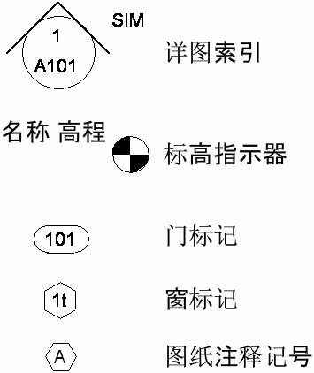 例如,下面的符号图例标识了在一系列施工图设计文件中使用的注释符号。