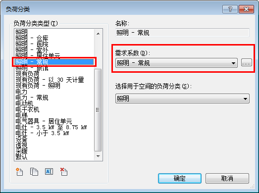 该照明需求系数已指定给相应的照明负荷分类类型。