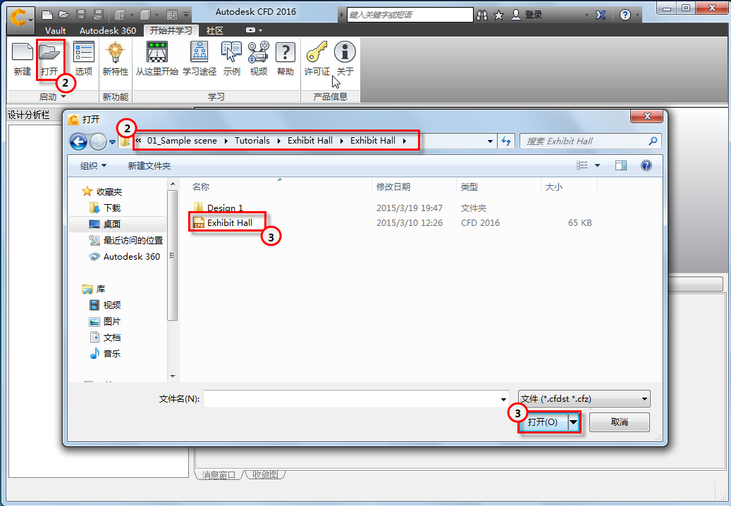 2. 在“启动”面板中,单击“打开”,然后导航到 C:\Users\Public\Public Documents\Autodesk\CFD 2017\Tutorials\Exhibit Hall。