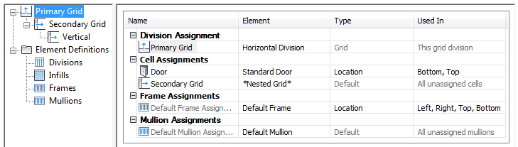 Each grid has its own cell assignments. You assign cells to contain another grid, a panel infill, or an object such as a door or window.