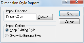 | Import Options | 包括「保留既有型式」,用來保留目前圖面中的標註型式,以及「覆蓋既有型式」,用來在目前圖面中覆蓋型式。「保留既有型式」選項會忽略匯入中具有相類似命名的型式;「覆蓋既有型式」則使用匯入中具有相類似命名的型式。 |