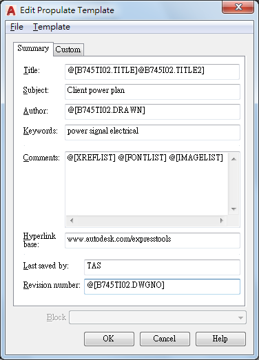 若要編輯樣板檔,請在適當的欄位中輸入文字或其中一個特殊的插入選項。例如,在「主旨」欄位中輸入「Downtown Renovation」時,會在使用此樣板處理的每個圖面中,將「Downtown Renovation」字串插入「圖面性質」對話方塊的主旨欄位。除了與此類似的文字字串以外,您可以使用四個特殊指令來萃取圖面特定資訊,並將該資料插入「圖面性質」對話方塊中。